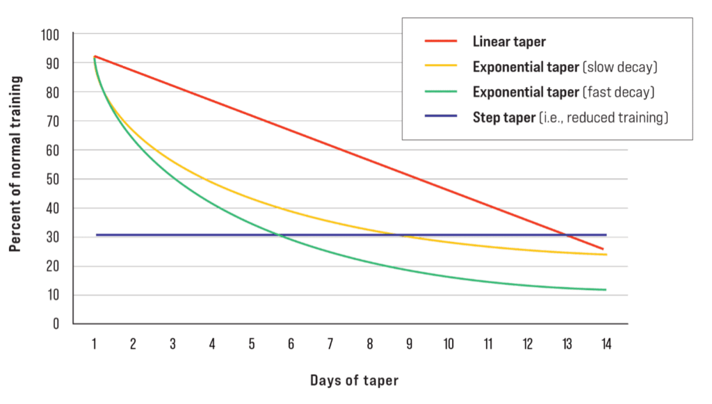 Training volume decreases in a curved fashion – either fast at the start (fast exponential) or slow at the start and faster closer to race (slow exponential).
